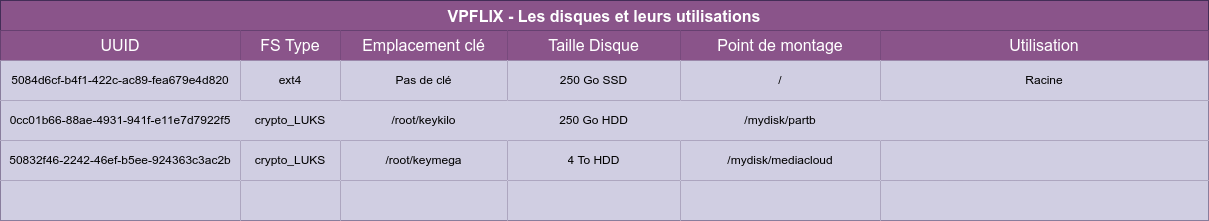 | UUID | FS Type | Key path | Taille - Disque | Montage | Utilisation |