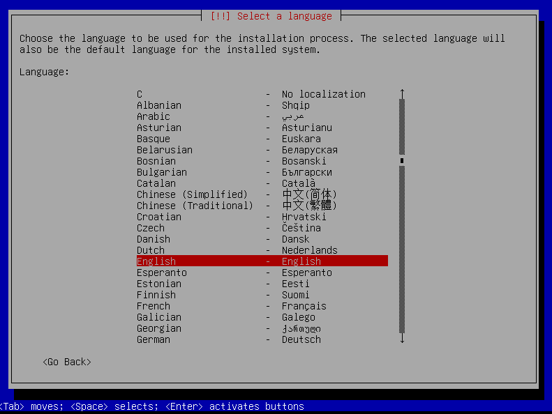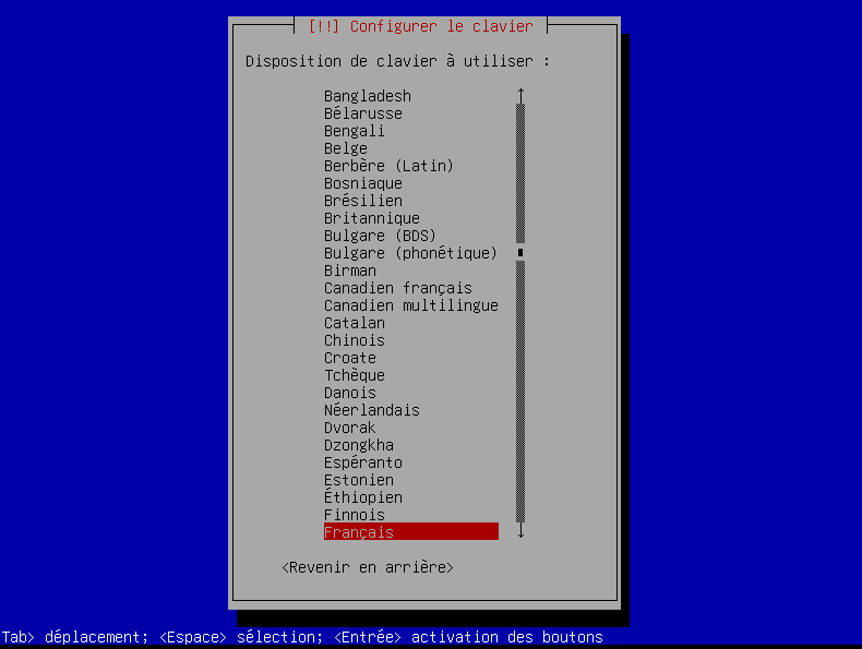 Cette étape est très importante elle va définir la disposition de votre clavier (AZERTY ou QWERTY) pour le serveur. Si vous choisissez une autre langue que le français il est possible que les touches de votre clavier ne correspondent pas à ce qui est saisie.