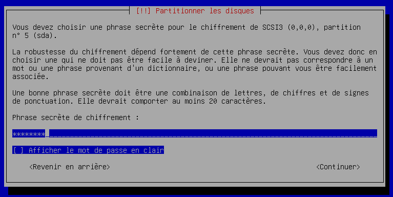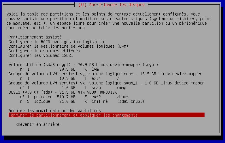 Nous avons terminé de configurer le disque principale avec un chiffrement de tout le disque.