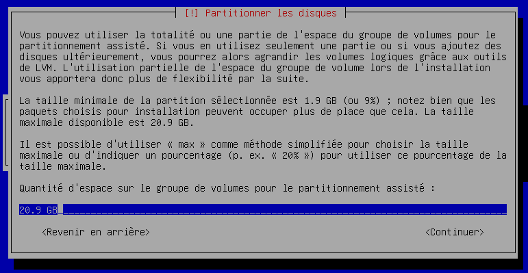 Cette étape permet de sélectionner une taille de partition, dans notre cas, nous voulons qu'une seule partition qui prendra tout le disque, je laisse donc la valeur par défaut :