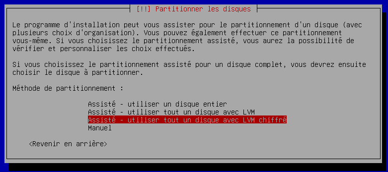 Lors de cette étape, nous avons plusieurs possibilités pour chiffrer un disque dur, je vais vous présenter la manière la plus simple avec la méthode : "Assisté - Utiliser tout un disque avec LVM chiffré"