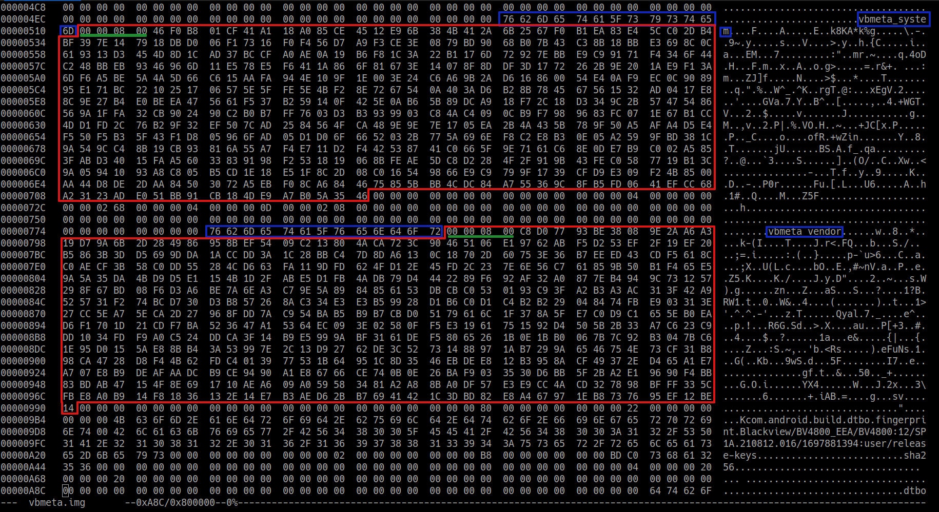From vbmeta.img we need to extract all the public keys of the partitions that were not altered (i.e. all the partitions listed in it, except the boot one). Browsing the vbmeta.img file with an hex editor it is easy to spot each entry of the list; it is composed as follows: