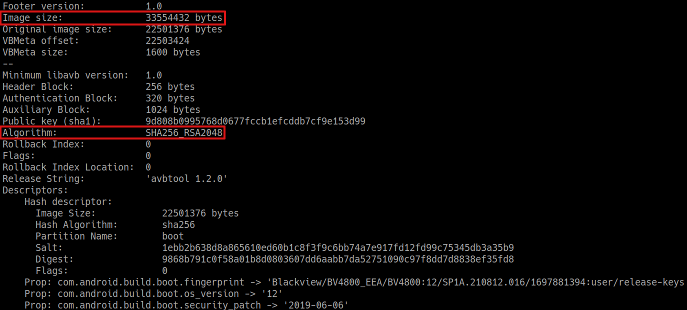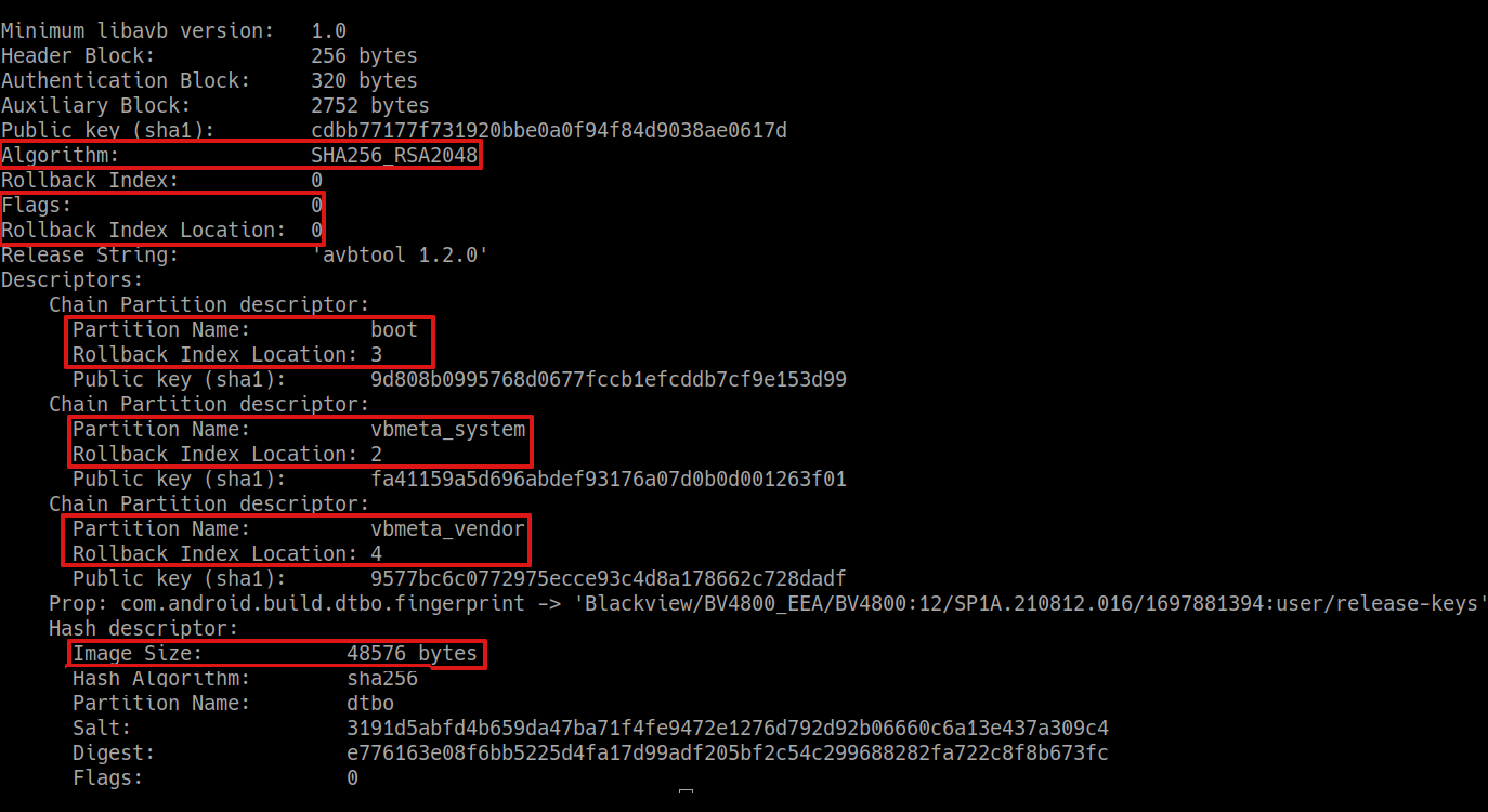 You should be able to understand each parameter: the flag (zero in our case), each partition name is followed by its Rollback Index Location and the name of the file containing the public key used to sign it, the padding size is the overall size of the vbmeta.img file.